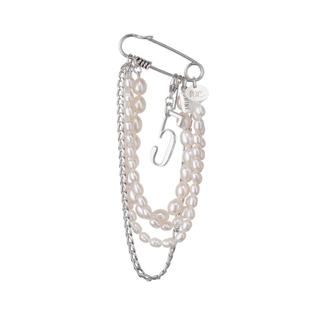 Diese besondere Anstecknadel kombiniert klassische Süßwasserperlen mit einer markanten Panzerkette – ein cooles Detail mit Twist. Ob am Blazer, Jeansjacke oder Kaschmirpulli: Dieses Accessoire verleiht jedem Look ein Upgrade – lässig oder elegant, ganz wie du willst. An der Anstecknadel hängen drei zarte Silberanhänger mit den handgestempelten Worten love, rise & shine – kleine Reminder für Deinen Alltag. Für eine persönliche Note lässt sich die Brosche mit einem NUMEROLOGY Anhänger mit Karabiner ergänzen – wähle deine persönliche 'lucky number' oder eine Zahl mit besonderer Bedeutung.