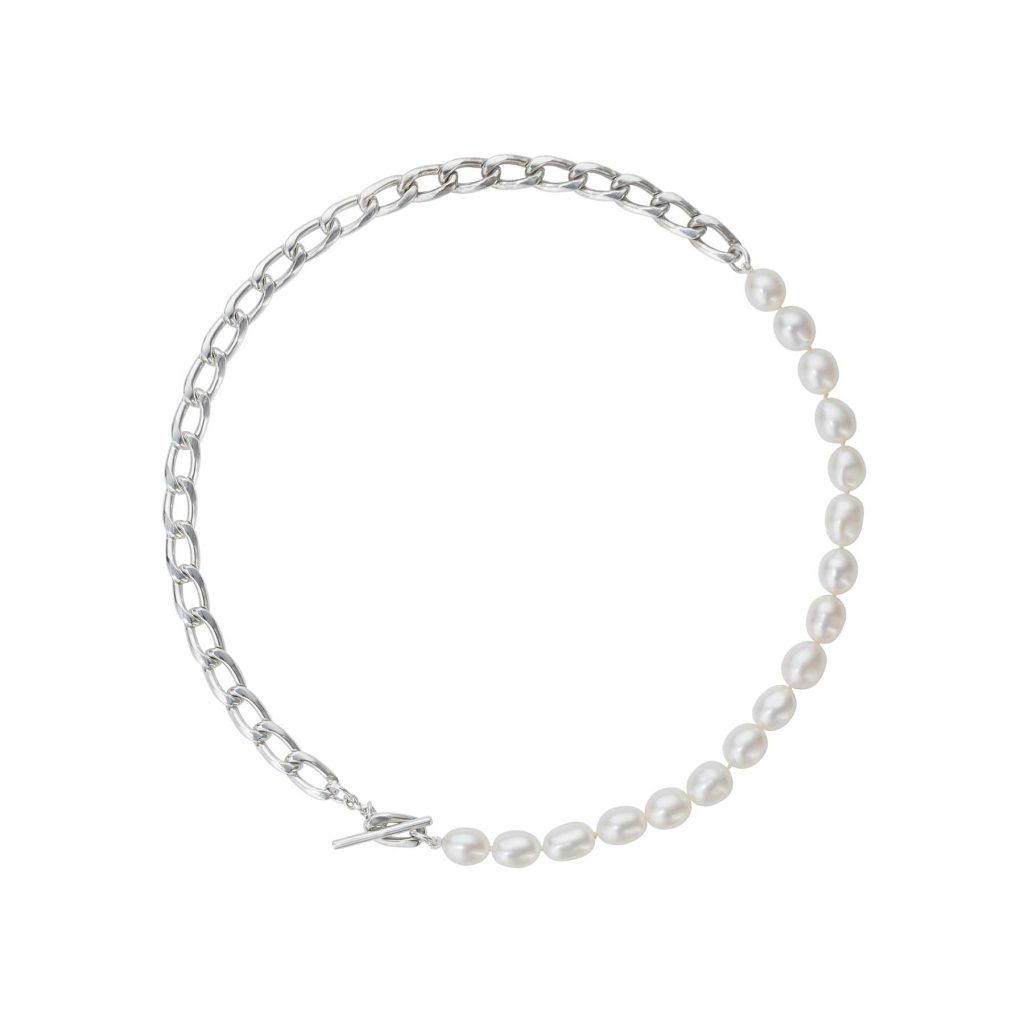 Ob solo getragen oder als Layering-Element – der kontrastreiche Materialmix aus kühlem Silber und zarten Perlen macht diese Kette zu einem besonderen Blickfang.